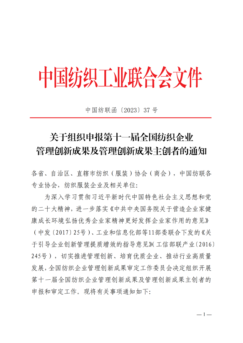 关于组织申报第十一届全国纺织企业管理创新成果及管理创新成果主创者的通知.pdf