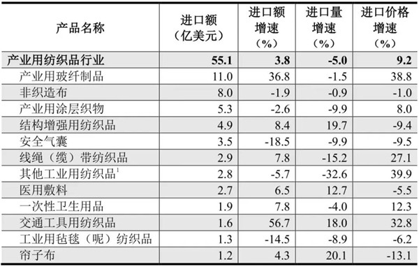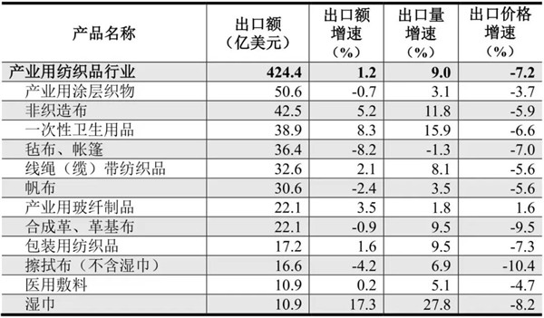 注:其他工业用纺织品主要包括PMP中空纤维膜、特殊涂层织物、过滤材料、半导体工业抛光材料等工业织物。