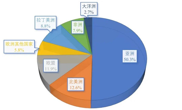 2025 年我国产业用纺织品对全球主要市场的出口表现呈现显著分化态势。亚洲是我国产业用纺织品最大的出口地区,占出口总额的50.3%,全年对该地区的出口额同比增长1.5%;我国对第二大出口市场北美地区的出口额同比下降8.9%,市场份额较2024年下滑1.4个百分点;对欧盟市场和拉美市场的出口额分别同比增长3.8%和5.3%,市场份额较2024年分别提升0.2个百分点和0.4个百分点;非洲市场的增长动能最为强劲,出口额同比增长11.6%,市场份额提升幅度居各主要市场之首,达到7.9%;对大洋洲的出口额同比下降1.2%,市场份额较2024年下滑0.1个百分点(如图2)。