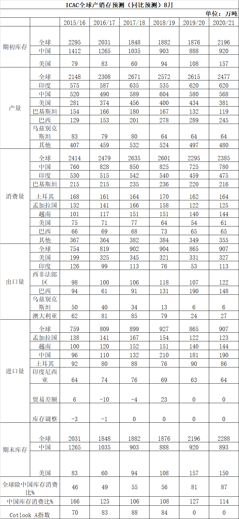 报告称,国际棉价2020年1月达到高点之后,在2月和3月下跌。2019/20年度考特鲁克A指数于4月份达到年度最低点,年度平均价为71.3美分/磅,连续第三由于订单不足而减少了个年度下跌。全球新冠疫情导致今年3月和4月棉花需求大幅下降。尽管价格很低,棉纺厂和服装织造厂由于订单不足而减少了生产。2019/20年度全球棉花消费量预计下降12%,为2300万吨。