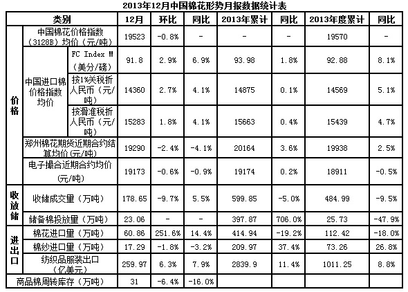 2013年,国际金融危机影响依然存在。纺织企业为应对困难,调整原料结构,棉花需求继续萎缩,市场成交低迷。在国家临时收储政策支撑下,棉价保持相对稳定,保障了棉农的基本收益。但由于收储和放储成为购销主渠道,市场缺乏活力。2014年中央一号文件决定在新疆实行棉花目标价格补贴试点,探索价格形成机制与政府补贴脱钩,棉花将重回市场机制。 棉花供给。2013年植棉面积继续下滑,中国棉花协会统计,全国植棉面积6993万亩,同比下降6.6%。气象条件总体好于常年,差于上年,棉花单产下降,全国棉花总产677万吨,同比下降12.5%。国家统计局统计,全国棉花产量631万吨,同比下降7.7%。内外棉价差较大,企业进口积极性较高,特别是配额外进口大幅飙升,进口量虽较上年减少,仍为历史次高值,全年进口棉花415万吨,同比下降19.2%。为满足纺织企业需求,2013年11月底启动储备棉投放,截至12月底,累计成交25.7万吨。 棉花需求。国际市场需求不旺,欧、日等部分销区纺织品服装需求继续减少,加之劳动力成本不断上升、人民币升值加速、内外棉价差较大等多种因素影响,纺织工业竞争力有所削弱,但主要统计指标仍以增长为主,部分指标增幅回落。国家统计局统计,2013年规模以上纺织工业增加值增长8.7%,增幅同比回落3.5个百分点;主要纺织品产量保持继续增长,其中化纤产量4134万吨,同比增长8.1%;纱产量继续增长,预计超过3000万吨;纺织品服装出口金额增速有所回升,海关统计,我国全年出口2840亿美元,同比增长11.4%,增幅同比增加8.6个百分点;国内消费保持增长,但增幅继续下降,限额以上企业(单位)全年服装鞋帽、针纺织品零售总额首超1万亿元,达到11414亿元,同比增长11.6%,增幅下降6个百分点。 棉花市场。2013年棉花市场由政策主导,国内棉花价格较上一年更加稳定。新年度之前中国棉花价格指数(CC Index328)稳定在19100-19400元/吨之间,新年度之后执行新标准,中国棉花价格指数(CC Index3128B)介于19400-19700元/吨之间,波动幅度始终在300元以内。 进入2013年度之后,交储仍为销售主渠道,大部分新棉入储。截止12月31日,2013年度棉花临时收储累计成交485万吨,约占当年产量的七成左右。在收储支撑下,籽棉收购价格同比上涨。受新棉上市推迟等因素影响,籽棉交售慢于上年。截止2013年底,全国棉农平均交售进度达到87.5%,同比减缓5.2个百分点。9-12月,400型加工企业标准级籽棉收购价格8.78元/公斤,同比上涨3.4%。收储同时,有关部门加大质量查处力度,截止12月底,中纤局查处“转圈棉”9起,还查处了伪造检验结果等问题,同时公布了11批退储名单。 2014年植棉意向。尽管收购价格有所上涨,但由于单产下降、成本继续上升,棉农收益不理想,且与其他农产品相比没有优势,除新疆因为效益稍好能保持基本稳定外,内地棉农植棉积极性持续下降。中国棉花协会12月植棉意向调查,2014年近五成棉农与上年持平,近四成准备减少种植面积或仍在徘徊,仅有一成左右准备增加面积。按照被调查棉农植棉意向加权平均计算,全国棉农平均种植意向减少8.9%。 1月19日,中央一号文件《关于全面深化农村改革 加快推进农业现代化的若干意见》正式公布,文件明确,坚持市场定价原则,探索推进农产品价格形成机制与政府补贴脱钩的改革,逐步建立农产品目标价格制度,在市场价格过高时补贴低收入消费者,在市场价格低于目标价格时按差价补贴生产者,切实保证农民收益。2014年,启动新疆棉花目标价格补贴试点。