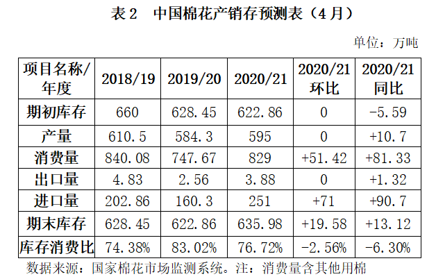 二、2020/21年度国内棉花需求量增加,产需缺口进一步扩大 基于相关专题调查和对国内外经济环境及市场状况的分析,2021年4月国家棉花市场监测系统对国内棉花产销存预测调整如下:2020/21年度我国棉花产量595万吨,与上月持平,同比增加10.7万吨,增幅1.83%;消费量829万吨,环比调增51.42万吨,增幅6.61%,同比增加81.33万吨,增幅10.88%;期末库存635.98万吨,环比调增19.58万吨,增幅3.18%,同比增加13.12万吨,增幅2.11%;产需缺口234万吨,较上年度扩大70.63万吨,库存消费比为76.72%,环比下调2.56个百分点,较上年度下降6.3个百分点。