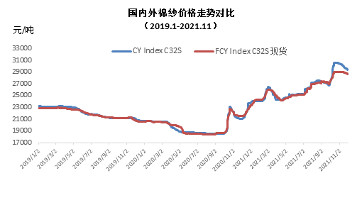 项目承担:北京棉花展望信息咨询有限公司 调查对象:新疆、山东、河北、河南、江苏、浙江、湖北、安徽、江西、山西、陕西、湖南等省、自治区的棉纺织企业 11月,棉花现货价格受成本支撑在高位震荡,但由于下游需求平淡,价格向产业链下游传导不畅,纱价总体稳中有跌,纺企利润明显收窄。据中国棉花预警系统对全国90余家定点纺织企业调查显示,本月纺织企业原料库存略有增加,纺织品产量环比略有下降,纱线库存和布库存增加。 一、纺织品产量环比略有下降 本月下游需求仍偏弱,织布厂开机率下滑,棉纱月内报价稳中有降,但成交以小单为主,订单并未明显增加,纱厂整体的库存继续增加。据调查,纱线产量环比下降1.1%,同比下降2.7%,其中纯棉纱占比为59.9%,较上月下降0.5个百分点;混纺纱和化纤纱占比为40.1%,较上月上升0.5个百分点。 布产量环比下降1.9%,同比下降3.8%,其中纯棉布占比较上月下降0.6个百分点。纱线销售率为75%,较上月下降3个百分点。 当前纺织企业纱线库存25.36天,较上月增加3.69天。坯布库存31.89天,较上月上升3.85天。 二、国内棉纱价格有所下跌 本月内外棉纱价格有所分化,国内下跌而进口纱略有上涨。国产32支纯棉纱11月均价29964元/吨,较上月下跌262元,跌幅0.87%,较去年同期上涨8621元,涨幅40.39%;进口32支纯棉纱11月均价28899元/吨,较上月上涨51元,涨幅0.18%,较去年同期上涨7203元,涨幅33.2%。