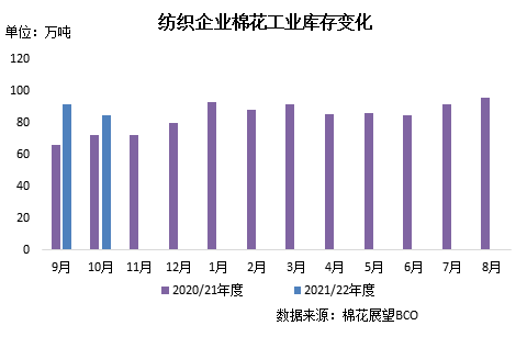 三、企业原料库存稳中有增 本月新花价格高企,纺织企业接受力度不足,多随用随买,并优先选用价格较便宜的储备棉,总体原料库存稳中有增。截至11月30日,纺织企业在库棉花工业库存量为84.97万吨,较上月底增加0.52万吨,同比增加12.2万吨。其中23%企业减少棉花库存,26%增加库存,48%基本保持不变。