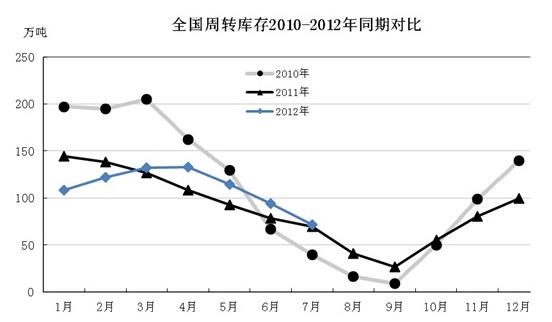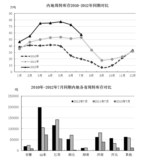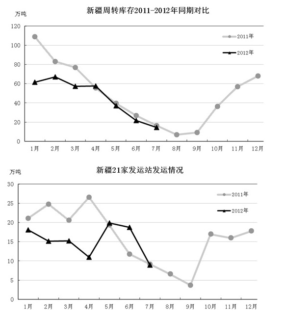 项目承担:中国棉花协会棉花仓储分会 监测对象:17个省市区124家棉花专业仓储仓库 7月国内棉花价格总体止跌企稳,部分地区纺织企业补库略有增加,成交较前期稍有好转,商品棉周转库存环比出现明显下降,但同比仍有所增加。新疆棉外运情况总体较好,实际装车数每天平均260车左右。 中国棉花协会棉花仓储分会对124家仓储会员单位统计,截至2012年7月底,商品棉周转库存总量为71.9万吨(其中内地库57.3万吨、新疆库14.6万吨),环比减少22.2万吨,同比增加2.6万吨。据此推算,全国商品棉周转库存总量约为87.12万吨,较上月减少26.36万吨。当月,新疆22家中转站点通过铁路共向内地发运棉花8.9万吨,环比减少9.8万吨,同比减少0.3万吨。据新疆发运站统计,2011年度前11个月(2011年9月至2012年7月),新疆通过铁路向内地累计发运商品棉161.4万吨。