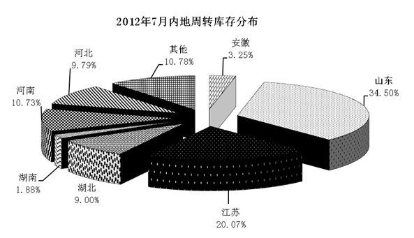一、 内地商品棉周转库存情况 截至7月底,内地102家棉花仓库的商品棉周转库存量57.3万吨,环比减少15.3万吨,同比增加4.3万吨。 从当月内地库存分布来看,山东和江苏库存量仍为最大,超过全国总量的一半,其次是河南、河北及湖北。其中山东34 %,环比上升7个百分点;江苏20%,环比下降5个百分点;河南10%,环比下降6个百分点;湖北9%,与上月持平;河北9%,环比上升1个百分点;安徽3%,环比上升1个百分点;湖南1%,与上月持平。