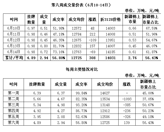 2019年中央储备棉轮出第六周(6月10-14日)投放量为4.89万吨,成交量为2.94万吨,成交率为56.80%。当周,储备棉标准级销售底价为13828元/吨,较前一周上涨3元/吨,成交平均价格12725元/吨。截至6月14日,储备棉累计投放31.15万吨,实际成交25.51吨,成交率81.90%。其中,新疆棉成交13.32万吨,占成交总量的52.22%。 在无利好信息释放的情况下,6月11日起郑棉和棉纱期货价格震荡上涨,带动当周储备棉成交率和成交均价小幅上扬。第六周,储备棉成交率较上周提升4.17个百分点,成交均价在四周连跌后上涨139元。 当前,国内消费需求有待提振,国际经济形势诡谲,棉纺织品消费及出口形势都不容乐观。中美贸易摩擦阴云何时散去,经济环境下行趋势何时逆转关乎企业生存,行业都在密切关注下一步发展态势。