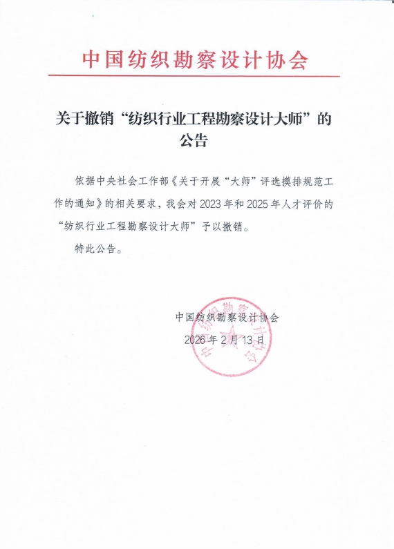 关于撤销纺织行业工程勘察设计大师的公告