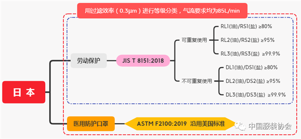 从过滤效率的分类来看,日本标准将口罩按照是否重复使用分为RL(可重复使用类型)和DL(不可重复使用类型),RL和DL再根据过滤效率分别分成三个级别,具体如下图所示: