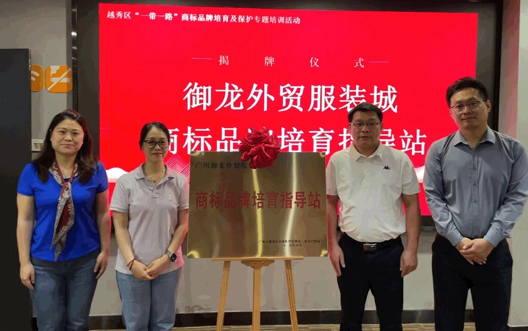 近日,广州御龙外贸服装城商标品牌培育指导站正式揭牌成立。该指导站是在广东省市场监督管理局(知识产权局)、广州市市场监督管理局(知识产权局)的指导支持下,由广州市越秀区市场监督管理局(知识产权局)主办,御龙市场、矿泉商会等单位协办的《越秀区“一带一路”商标品牌培育及保护专题培训活动御龙专场》的重要成果之一。