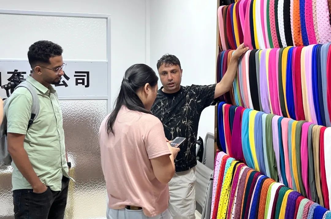 “布行天下·链合共生”系列主题活动邀请了包括也门、印度、埃塞俄比亚等国外国采购商和国内服装企业组成的国际采购团20余人,意向采购尼丝纺、锦涤纺、雪纺、乔其、丝棉等坯布产品,中国轻纺城坯布市场工作人员带领国际采购团走访了三楼坯布供应商,采购商对天翼纺织的人棉印花、布依坊的雪纺印花面料意向较高,详细记录了产品规格和价格。