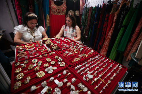 8月29日,在印度新德里市郊古尔冈,一个展位摆放着印式婚礼饰品。当日,印度新德里市郊古尔冈举行印式婚礼用品展。本次展览为期两天,来自印度全国各地30多家展商展出了传统印式婚礼所用的服装、饰品等。 (新华社)