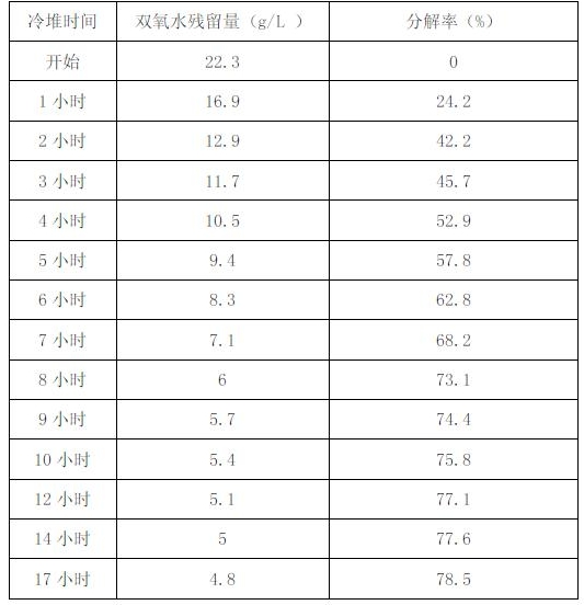 双氧水分解浆料大分子链,使浆料溶胀脱落,随时间的延长效果提高。但其双氧水分解结束也就预示着分解浆料的结束,通过化验室测定双氧水的分解率来确定冷堆时间。