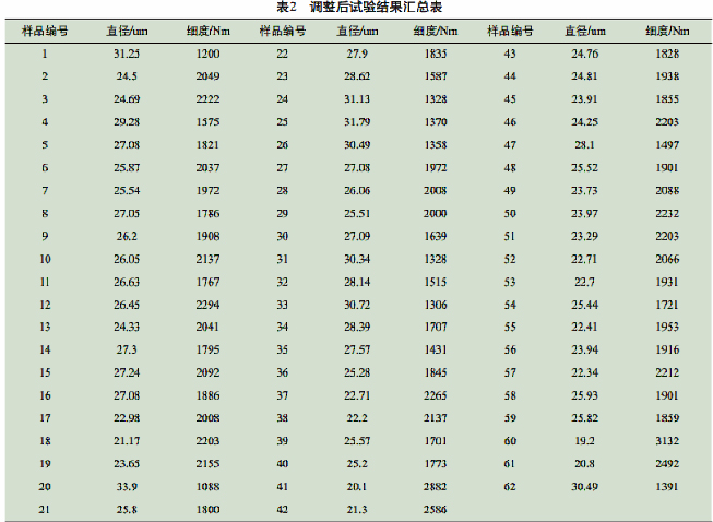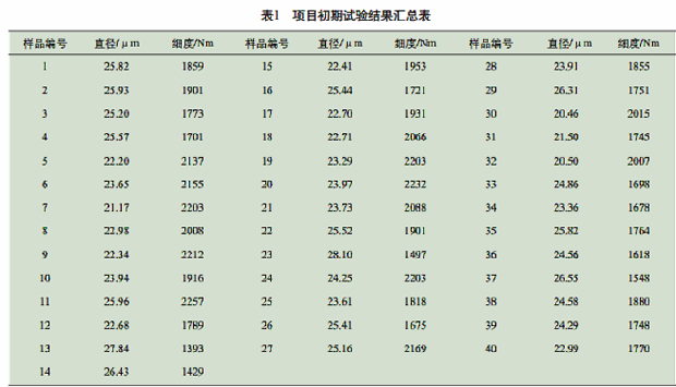 从图1可得R2=0.257,故相关系数R=0.507。根据α=0.05和自由度ν=n-2=38,查表得R0.05(38)=0.3044,因R=0.507>0.3044,故细度与直径的负二次方在α=0.05上是显著相关的,相关方程为y=1128.1+0.4335×106x-2。因为R越接近1,则相关性越好,而此次试验相关系数[5]为0.5,相关性不是很显著,为了进一步提高相关性,我们对研究初期的试验过程进行了研究分析。