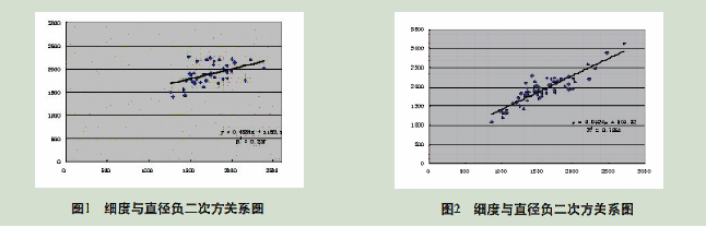 根据调整试验过程,对苎麻精干麻的纤维直径和纤维细度进行了重新测试,共测试了62组数据,结果汇总见表2,细度与直径负二次方关系见图2。从图2可得R2=0.7875,故相关系数R=0.8874。根据α=0.05和自由度ν=n-2=60,查表得R0.05(60)=0.2500,因R=0.8874>0.2500,故细度与直径的负二次方在α=0.05上是显著相关的,相关方程为y=504.76+0.893×106x-2。