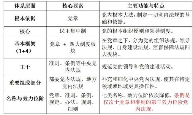 党内法规体系,是以党章为根本,以民主集中制为核心,以准则、条例等中央党内法规为主干,以部委党内法规、地方党内法规为重要组成部分,由各领域各层级党内法规组成的有机统一整体。