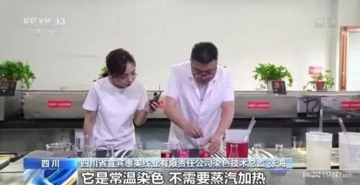 四川省宜宾惠美线业有限责任公司染色技术总监 张海:新型纱线改变了里面纱线的结构,它是常温染色、不需要蒸汽加热,而且它上染率非常高,只需要清洗一次就够了,节约了能源和水。