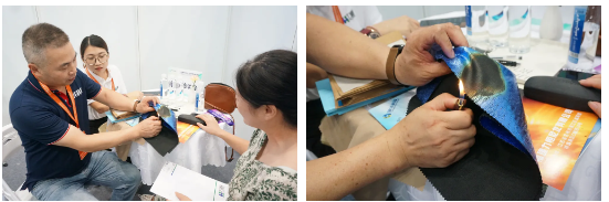 “我们现在对接了八家企业,有户外的,有做防护类工装的,其中,户外客户非常认可我们的一款肤感非常好、可以替代皮质的风衣面料,而工装客户则对我们的防火面料给予了高度好评。”说着,苏州棠华纳米科技有限公司张仁海掏出打火机现场演示,让我们亲眼看到了防火面料的防火性能之卓越,“我们可以做到性能媲美国际,但价格只有国外的十分之一。”