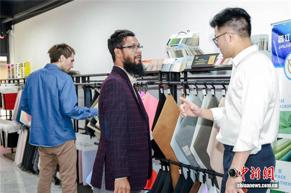 11月6日,第四届中国晋江国际鞋材采购节在福建晋江开幕。图为海外采购商在晋江国际鞋纺城走访商家、看样交流。 (晋江国际鞋纺城供图)