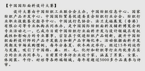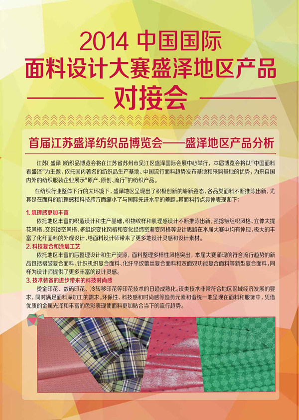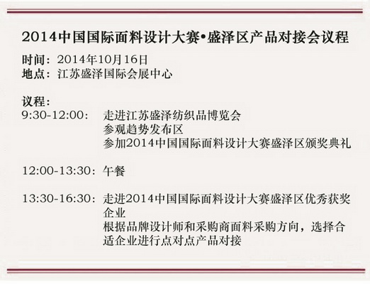 2014年10月16日,由中国纺织信息中心、国家纺织产品开发中心组织的“2014中国国际面料设计大赛盛泽区获奖产品对接会”将与“江苏(盛泽)首届纺织品博览会”同期隆重举办。